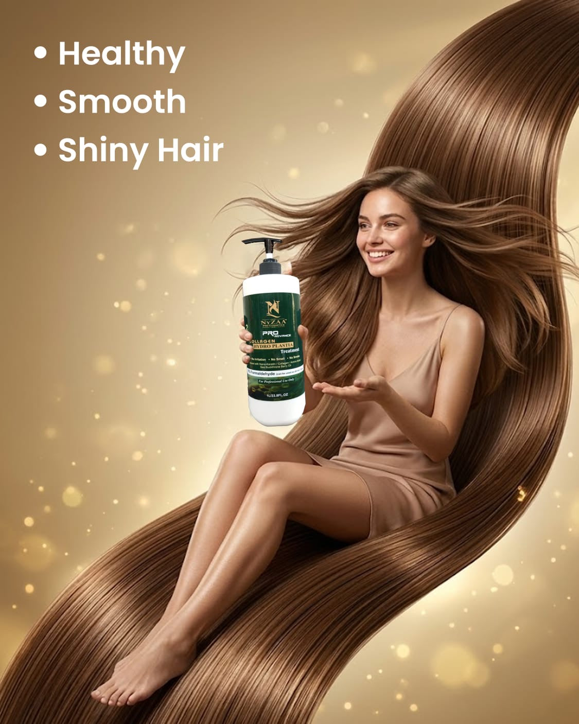 NyZAA collagen Hydro Plastia is a, formaldehyde-free hair treatment that uses to deeply nourish, straighten, and repair hair, offering, a, healthier alternative to traditional, straightening methods. It provides,